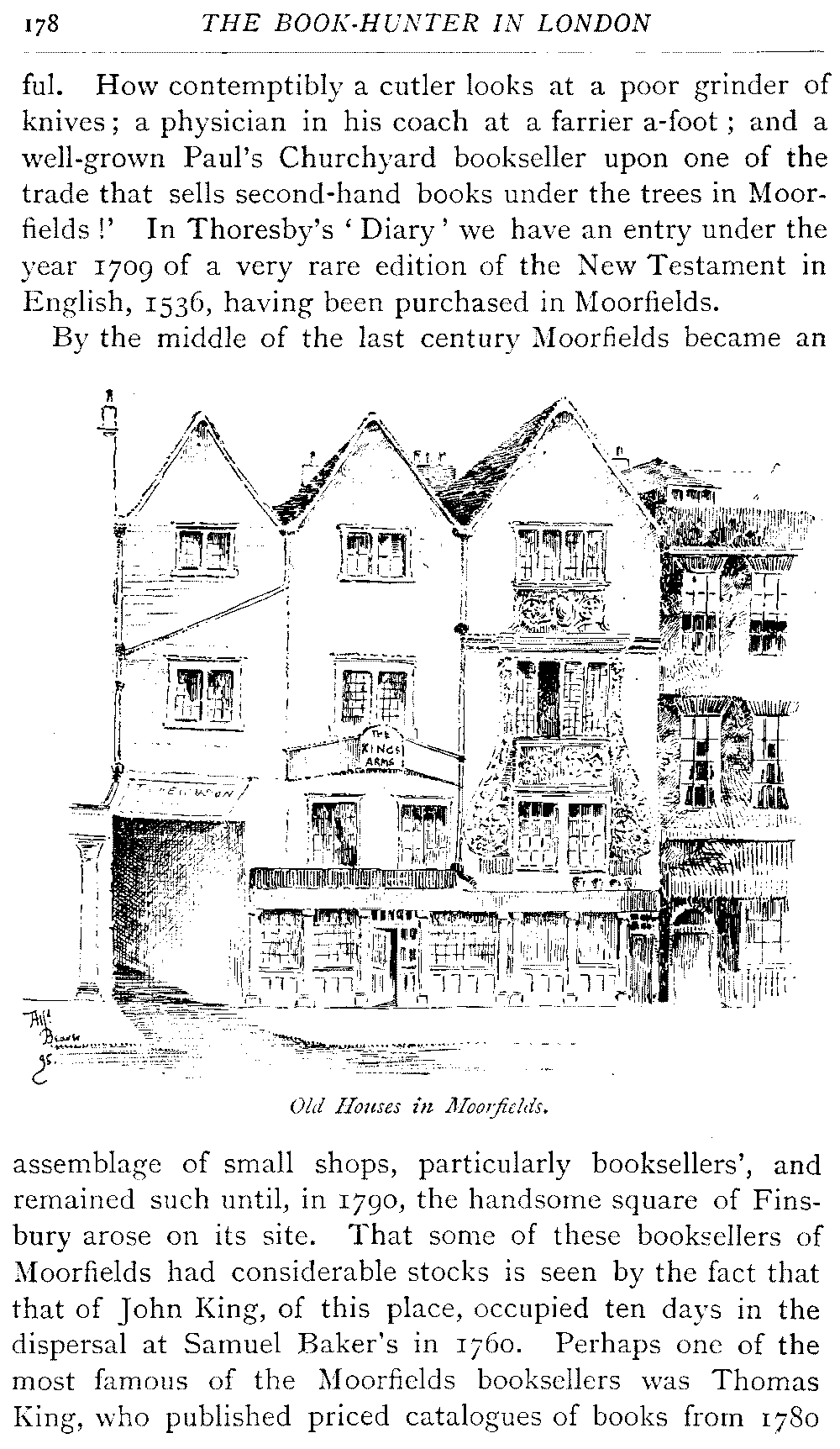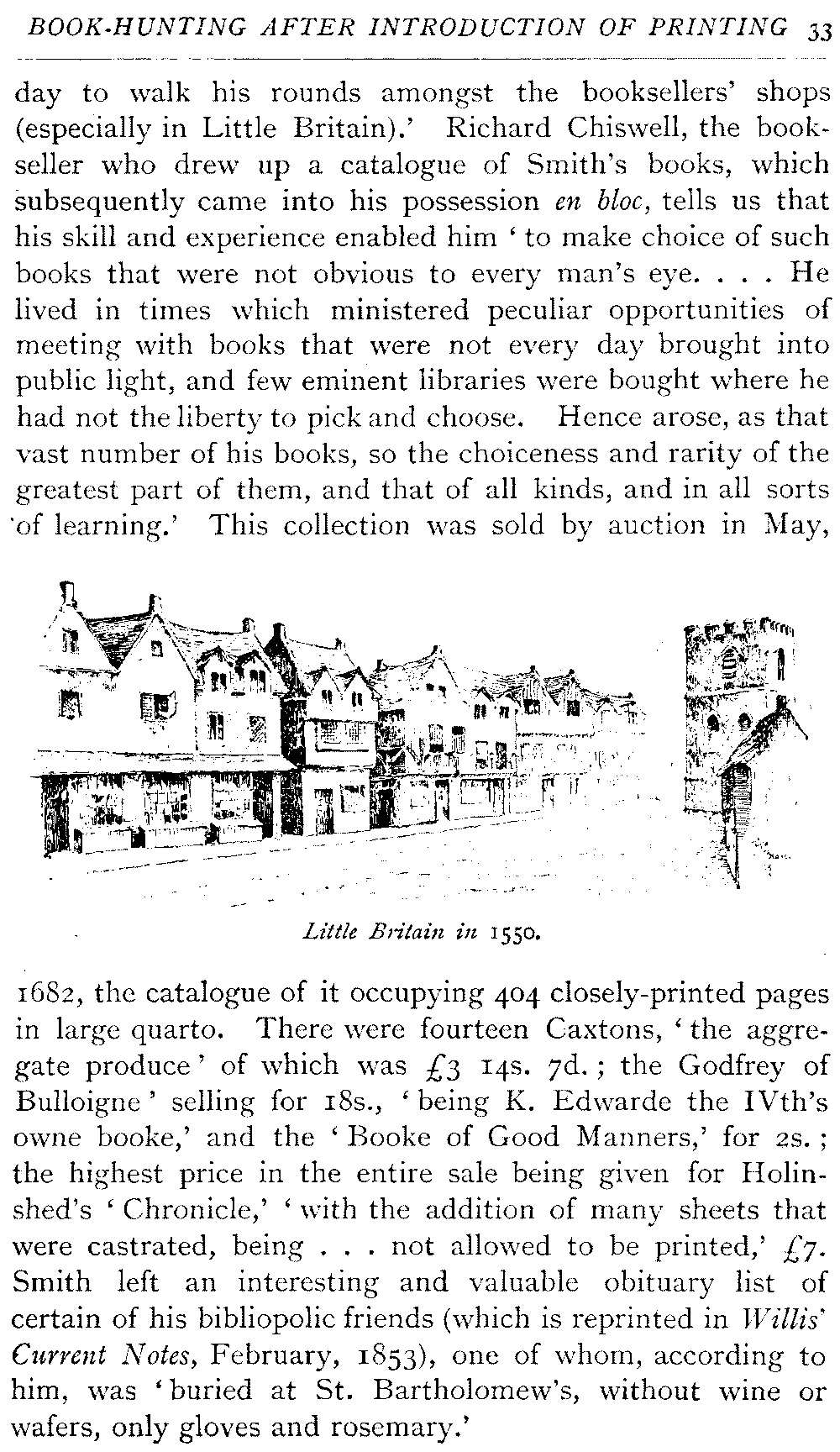 Scarcely any such thing as book-hunting or book-selling could possibly have existed in London before the accession of [3]Alfred, who, among the several ways in which he encouraged literature, is said to have given an estate to the author of a book on cosmography. Doubtless, it was after the rebuilding of the city by Alfred that, in the famous letter to Wulfseg, Bishop of London, he takes a retrospective view of the times in which they lived, as affording 'churches and monasteries filled with libraries of excellent books in several languages.' Bede describes London, even at the beginning of the eighth century, as a great market which traders frequented by land and sea; and from a passage in Gale we learn that books were brought into England for sale as early as 705. With the reconstruction of London, the wise government, and the enthusiastic love for letters which animated the great Saxon King, the commerce of the capital not only increased with great rapidity, but the commerce in books between England and other countries, particularly from such bibliopolic centres as Paris and Rome, began to assume very considerable proportions. If, as is undoubtedly the case, books were continually being imported, it follows that they found purchasers. By the beginning of the eleventh century there were many private and semi-private collections of books in or near London. The English book-collectors of the seventh century include Theodore, Archbishop of Canterbury, Benedict, Abbot of Wearmouth, and Bede; those of the eighth century, Ina, King of the West Saxons, and Alcuin, Abbot of Tours; whilst the tenth century included, in addition to Alfred, Scotus Erigena, Athelstan, and St. Dunstan, Archbishop of Canterbury.