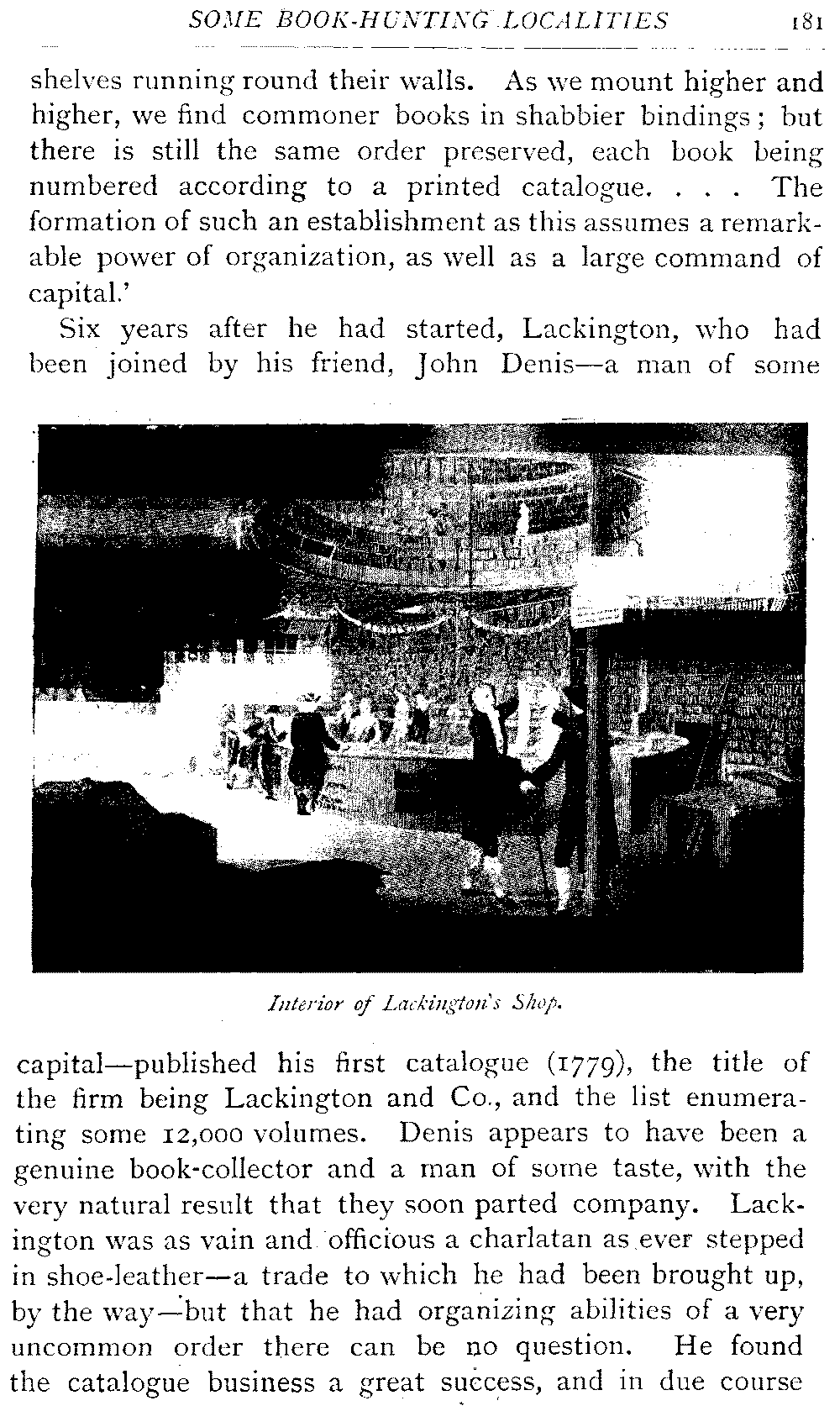 À propos of a literary man turning bookseller, the experiment has often been tried, but it has generally failed. Second-hand bookselling seems to be a frequent experiment after the failures [xxi]of other trades and callings. We have known grocers, greengrocers, coal-dealers, pianoforte-makers, printers, bookbinders, cheap-jacks, in London, adopt the selling of books as a means of livelihood. Sometimes—and several living examples might be cited—the experiment is a success, but frequently a failure. The knowledge of old books is not picked up in a month or a year. The misfortune which seems to dog the footsteps of many men in every move they make, does not fail to pursue them in bookselling. Some of them might almost say with Fulmer, in Cumberland's 'West Indian' (1771): 'I have beat through every quarter of the compass . . . I have blustered for prerogatives, I have bellowed for freedom, I have offered to serve my country, I have engaged to betray it . . . I have talked treason, writ treason. . . . And here I set up as a bookseller, but men leave off reading, and if I were to turn butcher I believe they'd leave off eating.'