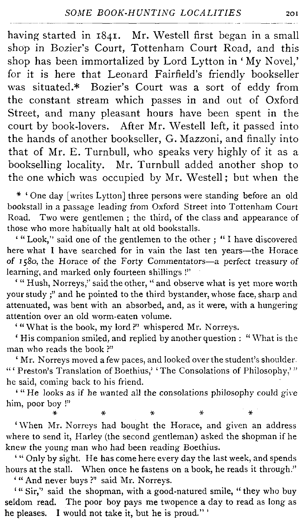 Cousin Pons and Don Vincente are extreme instances of bibliomaniacs to whom the possession of a book was the supreme happiness of life. The man of Fiction and the man of Fact were at one in this passion of acquisitiveness. Don Vincente was compelled by hunger—mala suada fames—to become a book seller; and if it became a general rule for book-collectors to become booksellers there would, we venture to think, be a very material increase in police-court and, perhaps, criminal cases generally. Mr. G. A. Sala tells us an amusing story of the late Frederick Guest Tomlins, a historian and journalist of repute. In the autumn of his life Tomlins decided to set up as a bookseller. He purposed to deal chiefly in mediæval literature, in which he was profoundly versed. The venture was scarcely successful. A customer entered his shop one day and asked for a particular book, as marked in the catalogue. 'I had really no idea it was there,' meditatively remarked Mr. Tomlins, as he ascended a ladder to a very high shelf and pulled out a squabby little tome. Then he remained about five-and-twenty minutes on the ladder absorbed in the perusal of the volume, when the customer, growing impatient, began to rap on the counter with his stick. Thereupon Mr. Tomlins came down the ladder. 'If you think,' he remarked, with calm severity, to the intending purchaser, 'that any considerations of vile dross will induce me to part with this rare and precious little volume, you are very much mistaken. It is like your impudence. Be off with you!' A not altogether dissimilar anecdote is related by Lord Lytton in that curious novel 'Zanoni,' in which one of the characters is an old bookseller who, after years of toil, succeeded in forming an almost perfect library of works on occult philosophy. Poor in everything but a genuine love for the mute companions of his old age, he was compelled to keep open his shop, and trade, as it were, in his own flesh. Let a customer enter, and his countenance fell; let him depart empty-handed, and he would smile gaily, oblivious for a time of bare cupboard and inward cravings.
