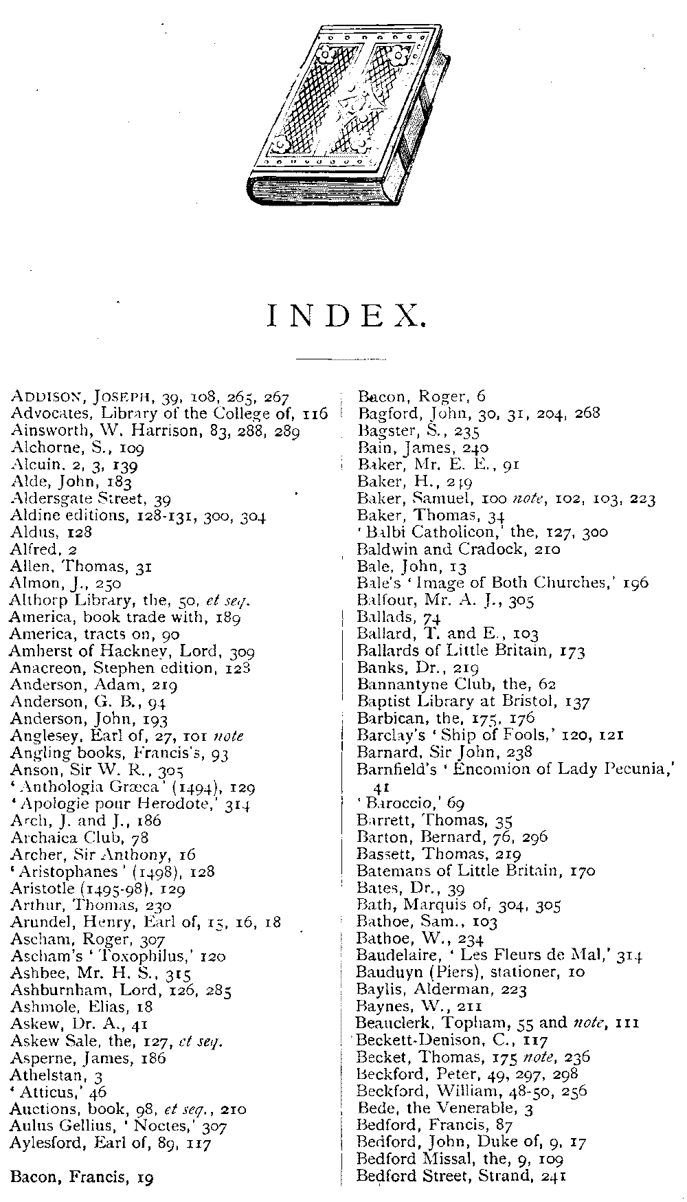 Differing in many, and often material, points as one book-collector does from another, the entire passion for collecting may be said to focus itself into two well-defined grooves. A [xvii]man either collects books for his own intellectual profit, or out of pure ostentatious vanity. In the ensuing pages there will be found ample and material facts in regard to the former, so that we may say here all that we have to say regarding the latter. The second type of book-enthusiast has two of the most powerful factors in his apparently reckless career—his own book-greed, and the bookseller who supplies and profits by him.