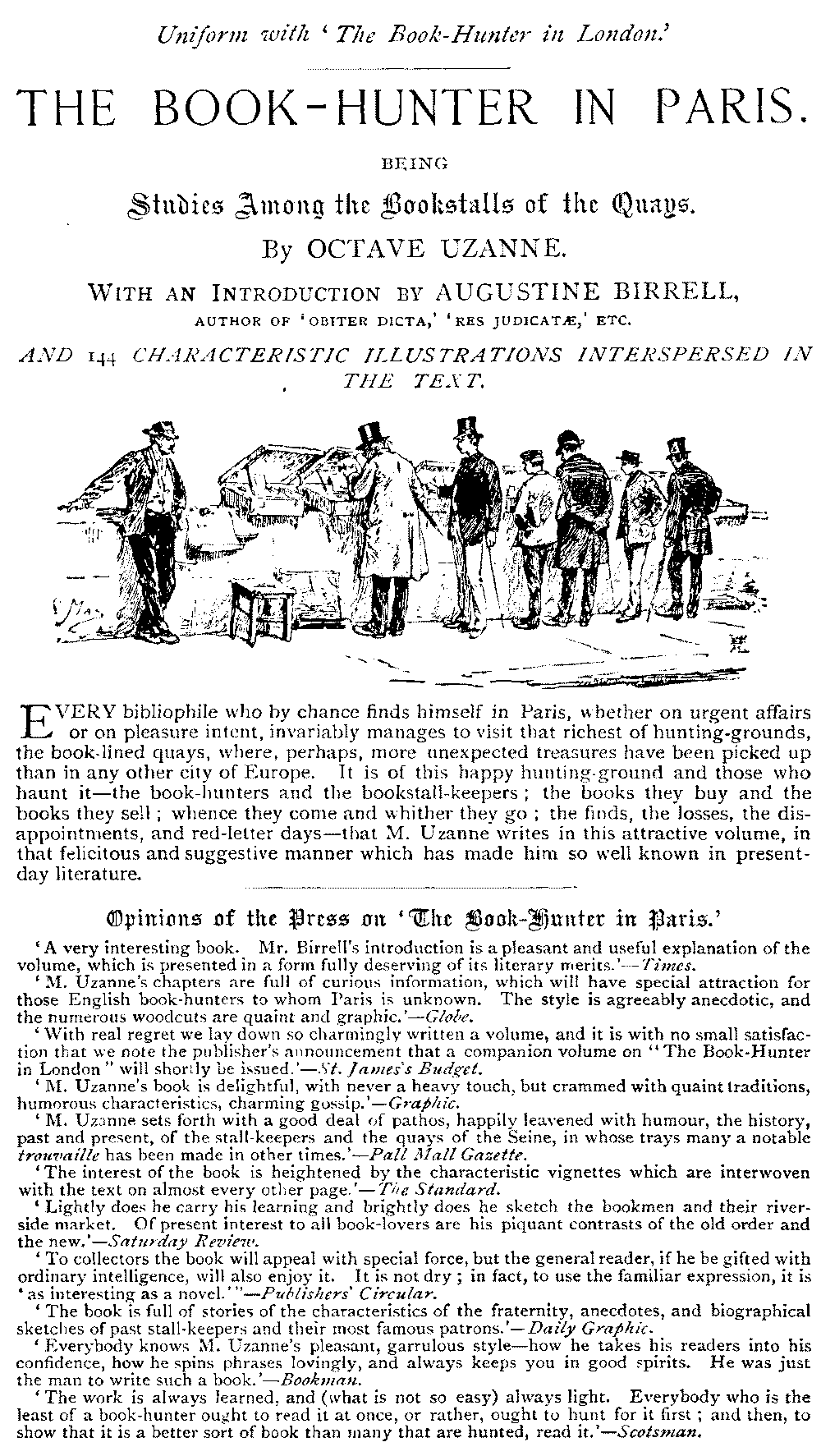 'THE Book-hunter in London' is put forth as a contribution to the fascinating history of book-collecting in the metropolis; it does not pretend to be a complete record of a far-reaching subject, which a dozen volumes would not exhaust; the present work, however, is the first attempt to deal with it in anything like a comprehensive manner, but of how far or in what degree this attempt is successful the reader himself must decide.