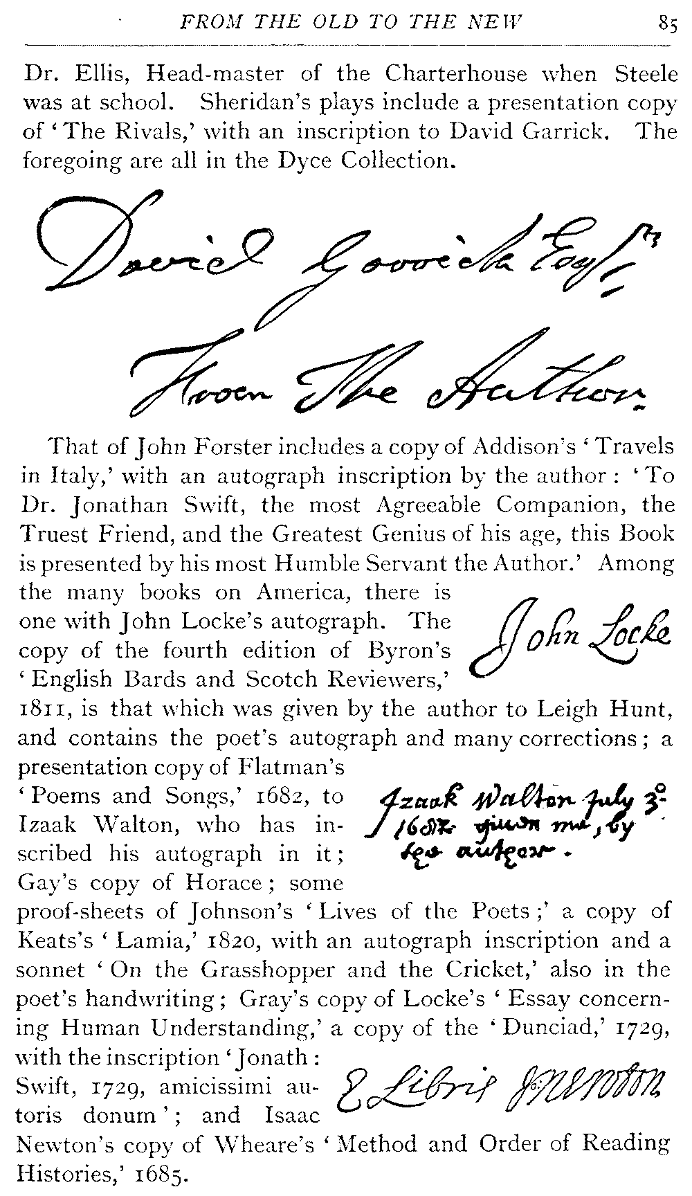 As an illustration of the enhanced value possessed by books having notes written in them by their owners, it may be mentioned that when the great Mr. Fox's furniture was sold by auction after his death in 1806, amongst the books there happened to be the first volume of Gibbon's 'Decline and Fall,' which apparently had been given by the author to Fox, who wrote on the fly-leaf this note: 'The author at Brooks' said there was no salvation for this country, until six heads of the principal persons in the administration were laid on the table. Eleven days after, this same gentleman accepted a place of "lord of trade" under those very ministers, and has acted with them ever since.' This peculiarly nasty little note sent the [xxviii]value of the odd volume up to £3 3s. Gibbon, writing in his 'Autobiography' of Fox, says, 'I admired the powers of a superior man, as they are blended in his attractive character with the softness and simplicity of a child,' an opinion which he might have modified if he had lived to read the foregoing note. When Canning's books, for the most part of an exceedingly commonplace and uninteresting character, came under the hammer at Christie's in 1828, the competition was extremely keen for all volumes which bore the great statesman's autograph, and as most of the books contained more or less elaborate indications of Canning's proprietorship, his executors received nearly double the sum which they could reasonably expect. Similar illustrations occur every year at book-auctions.