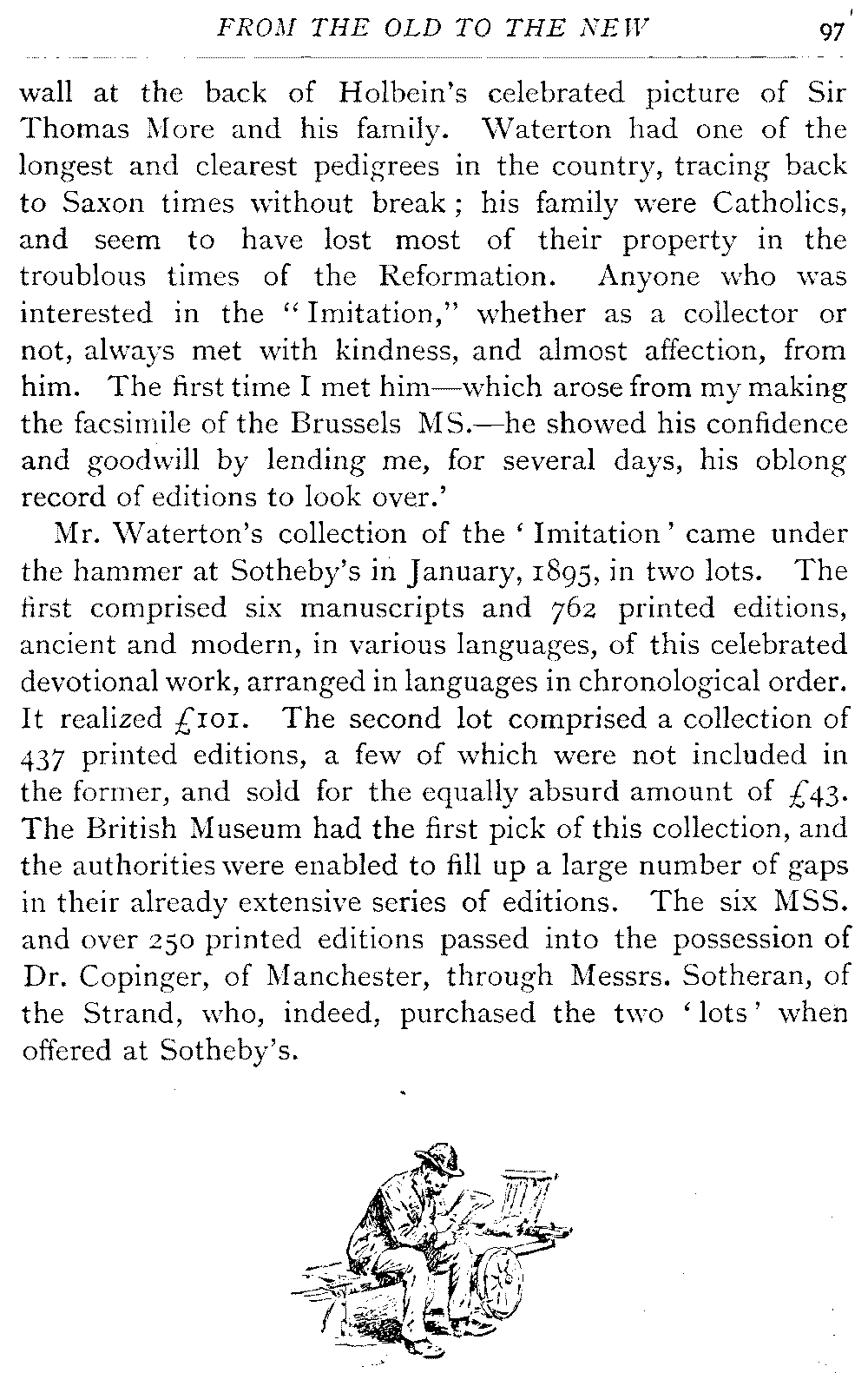 Last summer a certain bookseller sold, after some considerable amount of haggling, a very fine Missal for £65, which was £5 less than its catalogue price. A few weeks after the [xxxi]purchaser called and paid the additional £5, explaining that a friend of his had taken a violent fancy to the book, and begged to be allowed to possess it at £70. Another honest book-collector, discovering that he had bought a book considerably cheaper than an example had been sold at Sotheby's, and £2 less than Mr. Quaritch had asked for a similar copy, sent his bookseller a present of a parcel of books to make up the difference in the two amounts.