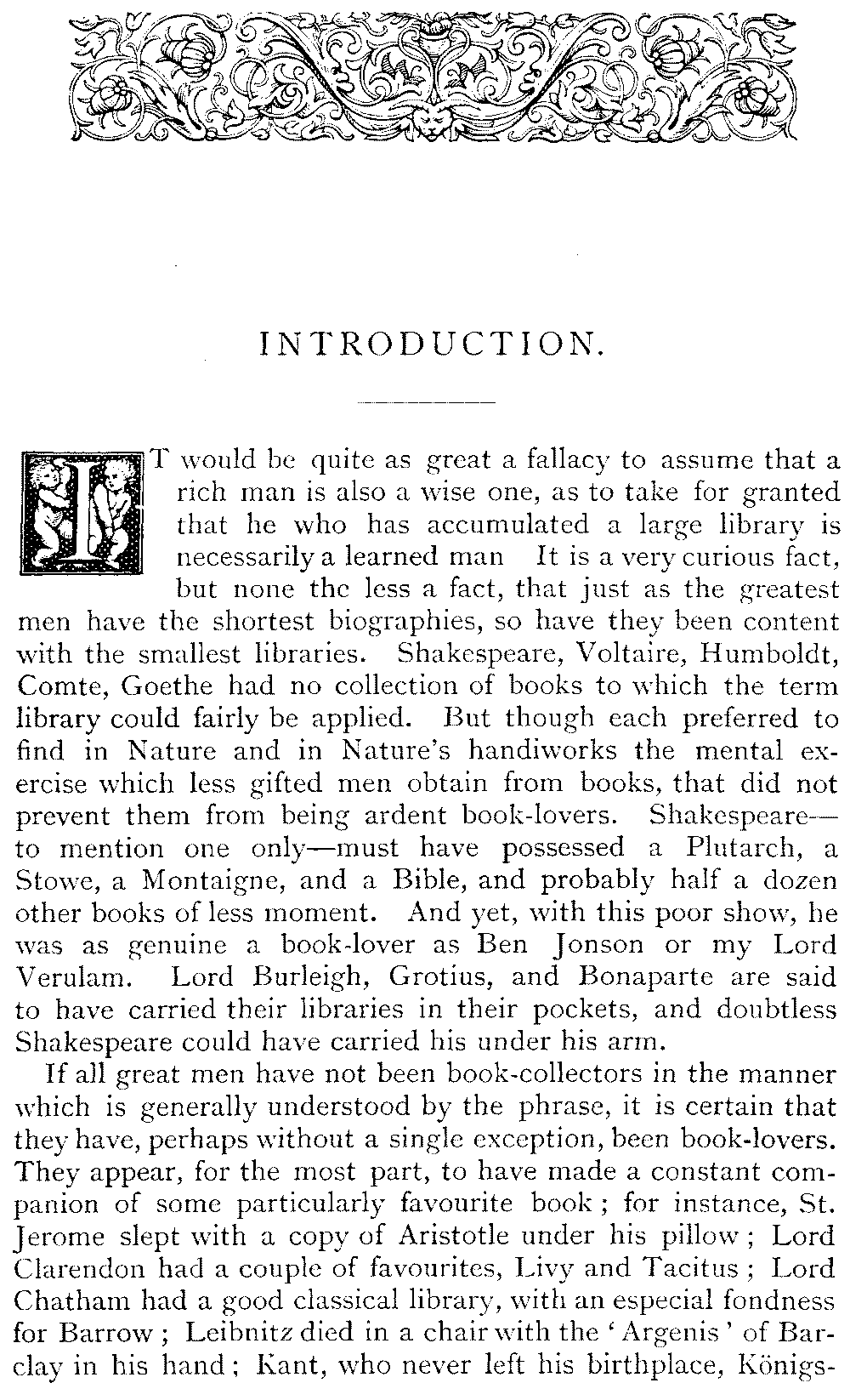 IT would be quite as great a fallacy to assume that a rich man is also a wise one, as to take for granted that he who has accumulated a large library is necessarily a learned man. It is a very curious fact, but none the less a fact, that just as the greatest men have the shortest biographies, so have they been content with the smallest libraries. Shakespeare, Voltaire, Humboldt, Comte, Goethe had no collection of books to which the term library could fairly be applied. But though each preferred to find in Nature and in Nature's handiworks the mental exercise which less gifted men obtain from books, that did not prevent them from being ardent book-lovers. Shakespeare—to mention one only—must have possessed a Plutarch, a Stowe, a Montaigne, and a Bible, and probably half a dozen other books of less moment. And yet, with this poor show, he was as genuine a book-lover as Ben Jonson or my Lord Verulam. Lord Burleigh, Grotius, and Bonaparte are said to have carried their libraries in their pockets, and doubtless Shakespeare could have carried his under his arm.