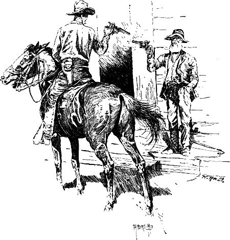 Darauf ritt er hin und machte dem Betreffenden Vorhalt mit einem sechsläufigen Revolver, wogegen sich dieser mit dem seinigen entschuldigte. Als die Pistolen leer waren, nahm der Unbekannte sein Geschäft (er flickte sich seine Peitschenschnur) wieder auf, während Herr Harris mit höflichem Bückling an uns vorbei nach Hause ritt. Er hatte eine Kugel durch den einen Lungenflügel und mehrere in die Hüften bekommen, und die kleinen Blutströme, die dem Pferd über die Flanken liefen, gaben dem Tier ein ganz malerisches Aussehen. Ich habe später, so oft[9] ich Harris nach jemand schießen sah, immer wieder an jenen ersten Tag in Carson denken müssen.