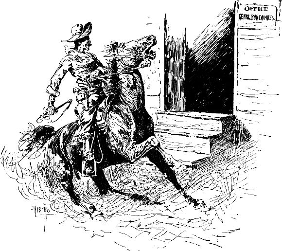 Dieses Keuchen und Schnauben! Wie die roten Nüstern des Pferdes arbeiteten und seine wilden Augen blitzten! Aber war der störrische Gaul etwa geduckt? Nein, wahrhaftig nicht. Seine Herrlichkeit der ›Sprecher des Hauses‹ glaubte das und wollte auf ihm nach dem Kapitol (Regierungsgebäude) reiten. Allein sogleich machte das Geschöpf einen Satz über einen Haufen[34] Telegraphenstangen weg, halb so hoch wie eine Kirche, und den Weg nach dem Kapitol – eine und dreiviertel Meilen – flog es anstatt zu laufen, d. h. es sauste schnurgerade über alles hinweg, indem es Zäune und Gräben den Krümmungen der Straße vorzog. Als der Sprecher nach dem Kapitol gelangte, war er weit mehr in der Luft gewesen, als auf dem Pferderücken und meinte, ihm sei zu Mute, als habe er die Tour auf einem Kometen gemacht.