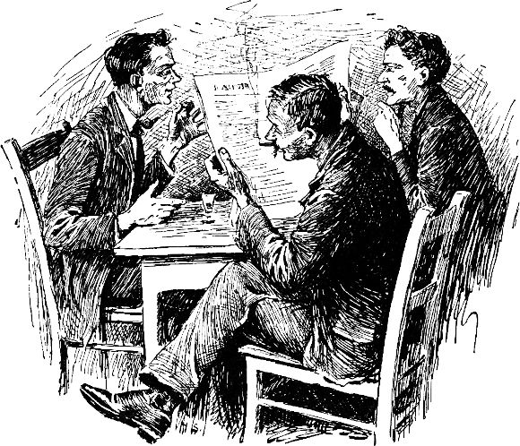 Ich war nicht im stande, etwas vorzuschlagen, ich hatte[314] während der ganzen Zeit gewürgt und gewürgt und hielt es nicht für geraten, den Mund zu öffnen. Thompson begann in abgebrochenen Sätzen über die dumme Geschichte zu brummen, wobei er meinen Freund verschiedentlich titulierte; die Titel wurden immer größer, je eifriger er redete. Schließlich sagte er: