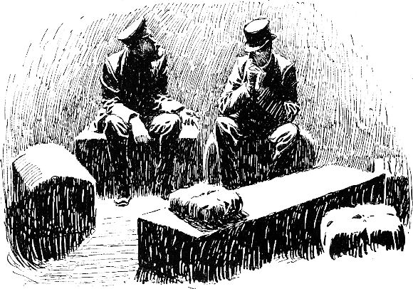Wir gingen wieder hinein, nachdem wir tüchtig durchgefroren waren, aber es war drinnen kaum zum aushalten. Es blieb uns nichts übrig, als abwechselnd hinaus und hinein zu gehen; eine Abwechslung zwischen Erfrieren und Auftauen. Nach einer Stunde etwa hielten wir an einer andern Station; beim Abfahren kam Thompson mit einem Bündel herein und sagte: