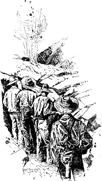 Der Boden war mit einer hohen Schicht trockener Fichtennadeln bedeckt, die bei der ersten Berührung mit dem Feuer aufflammten wie Schießpulver. Es war merkwürdig anzusehen, mit wie rasender Eile die gewaltige Flammensäule sich fortbewegte. Mein Kaffeetopf war dahin und alles andere mit ihm. Nach anderthalb Minuten ergriff das Feuer einen dichten Busch trockenen Manzanita-Gesträuchs von sechs bis acht Fuß Höhe, und nun wurde das Brausen, Zischen und Prasseln geradezu fürchterlich. Die durchdringende Hitze trieb uns in das Boot, wo wir, wie durch einen Zauber gefesselt, verblieben.