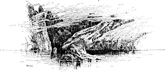 Wir befanden uns am Nordufer. Hier waren die Felsen auf dem Grunde grau oder weiß. Dadurch kommt die wunderbare Durchsichtigkeit des Wassers zu vollerer Geltung als sonst irgendwo auf dem See. Gewöhnlich ruderten wir etwa hundert[24] Ellen weit hinaus vom Ufer, dann legten wir uns im Sonnenschein auf die Sitzbretter und ließen das Boot treiben, wohin es wollte. Selten sprachen wir ein Wort; das hätte nur die Sabbatstille unterbrochen und uns in den Träumen gestört, die wir unserer üppigen Ruhe und Trägheit verdankten. Das Ufer war allenthalben durch tiefe Buchten und Baien ausgezackt, die von schmalen Sandbänken begrenzt wurden; wo der Sand endete, stiegen die schroffen Bergwände in den Himmelsraum auf, wie eine ungeheure, fast senkrechte Mauer, die dicht mit hochragenden Fichten bewachsen ist.