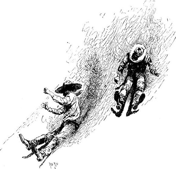 Nach einem Galopp von sechzehn Meilen kamen der kalifornische Jüngling und der echte mexikanische Stöpsel wieder in die Stadt gejagt. Die Schaumflocken flogen um sie herum, wie um das Flugwasser, das vor einem Wirbelsturm dahertreibt. Mit einem letzten Satz, den sie über einen Schubkarren und einen Chinesen weg machten, warfen sie vor dem Ranch Anker.